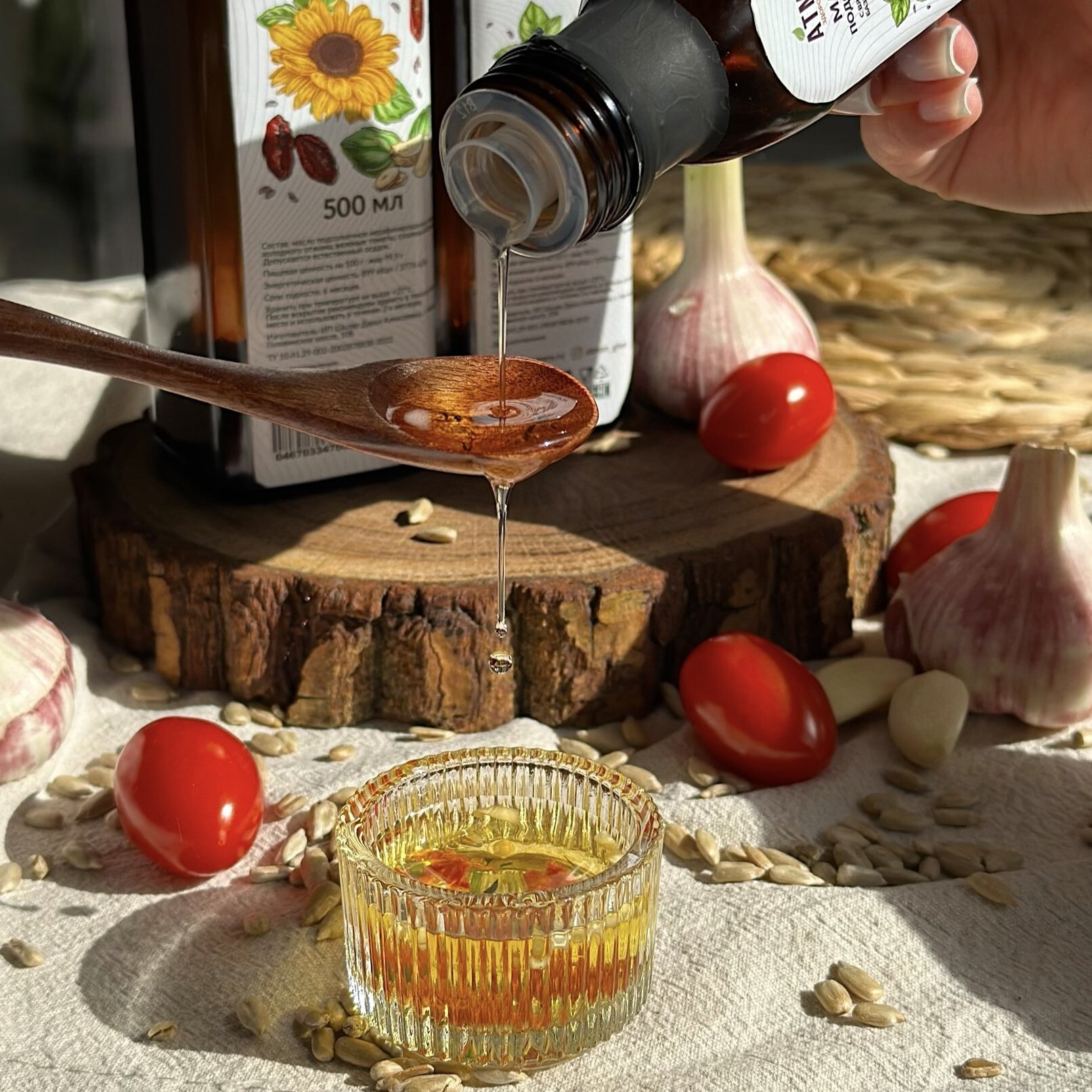 - подсолнечное масло с вялеными томатами, базиликом и чесноком.